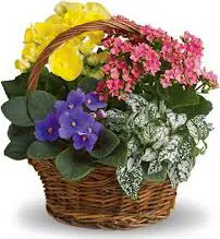 Composizione in cesto di Piante fiorite miste dai toni allegri. Una colorata composizione a domicilio per un giorno speciale come un compleanno.