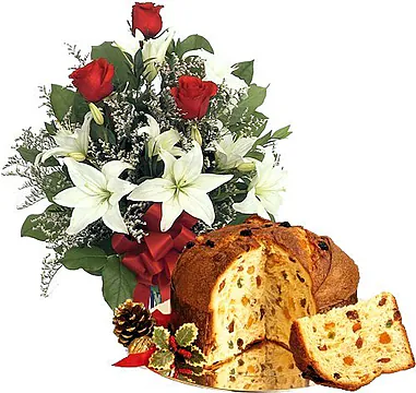 Augura un buon Natale con un bouquet di 3 rose rosse e gigli o lilium dai toni chiari confezionato con verde decorativo di stagione, abbinato ad un panettone. Adatto per le festività natalizie.