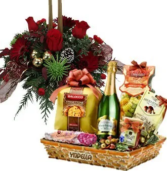Augura un buon Natale con un centrotavola di rose, gerbere e fiori misti di stagione dai toni caldi, verde decorativo e candele, abbinato ad un cesto di prodotti tipici con panettone e spumante. Adatto per le festività natalizie.