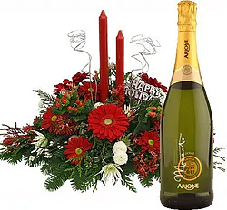 Centrotavola natalizio di rose, gerbere e fiori misti dai toni caldi con Champagne